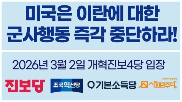 개혁진보 4당은 미국과 이스라엘을 강력히 규탄하며, 즉각적인 공격 중단과 외교 협상 복귀를 촉구한다. 유엔 헌장과 국제 인도법이라는 최소한의 국제질서를 다시 세워야 한다. 정부도 평화적 문제 해결이라는 원칙을 분명히 하고, 자국민 안전 확보에 총력을 다하길 바란다.