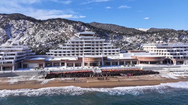 조선민주주의인민공화국 내각 총리 박태성동지가 염분진해양려관 일군,종업원들과 함께 준공테프를 끊었다.