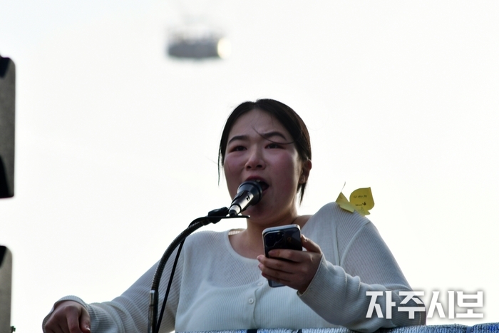 ▲ “자신들의 침략전쟁을 위해 주둔하며 좋은 땅에서 돈 한 푼 안 내고 호의호식, 자기 멋대로 굴며 땅 오염시키고, 자기들 멋대로 범죄 일으켜도 처벌 하나 받지 않은 것이 주한미군 아닌가?” -윤민 한국대학생진보연합 회원. © 박명훈 기자 |