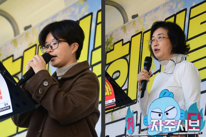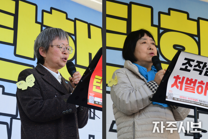 ▲ “이대로 가면 지방선거마저 조희대 사법부가 개입하게 된다. 내란 부역 언론도 명태균이 돌린 것 같은 여론조사를 내보내며 민심을 왜곡할 것이다. 검찰, 언론, 내란당, 사법부가 한 몸처럼 움직이는데, 이들의 최후 보루 조희대 대법원장 탄핵부터 빠르게 가야 하는 거 아닌가?” -변은혜 노원중랑촛불행동 대표. © 박명훈 기자 |