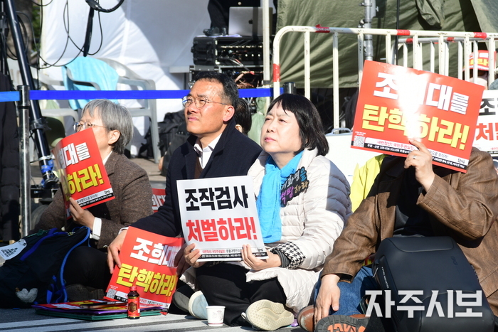 사회를 맡은 김지선 촛불행동 공동대표는 “조희대 탄핵안 발의 서명을 받고서도 본회의가 여러 번 열렸는데 조희대 탄핵안 발의가 깜깜무소식”이라며 “열심히 수사해서 보내면 뭐 하나? 내란 청산을 마음먹고 방해하는 조희대가 있는 한 다 헛수고 아닌가?”라고 지적했다.
