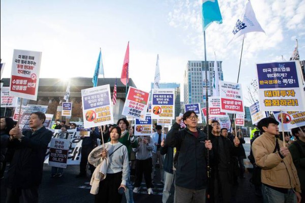 함재규 민주노총 통일위원장은 “미국에 공장을 짓는다고 우리의 이익이 되는가. 국내 브랜드의 이름으로 미국에서 생산하면 그 이익이 국내에, 우리 시민들에게 돌아오는가. 절대 아니다. 미국의 회사와 미국에만 이익이 돌아갈 뿐”이라고 말했다