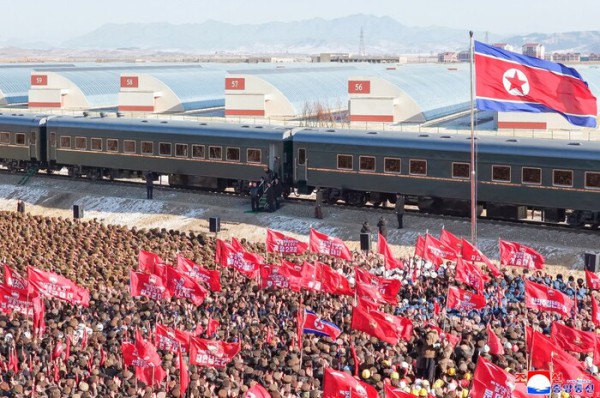 김정은동지께서 전용렬차에서 내리시자 전체 청년건설자들은 뜻깊은 새해의 첫 령도자욱을 자기들의 건설장에 아로새기시며 친어버이의 따뜻한 축복을 안겨주시는 원수님을 우러러 열광의 환호를 올리고 또 올리였다.