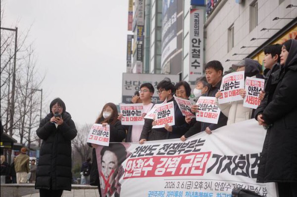 정당과 시민단체가 미국을 향해 ‘북한 침공’을 요청한 안철수 국힘당 국회의원을 규탄하는 기자회견을 6일 개최했다.