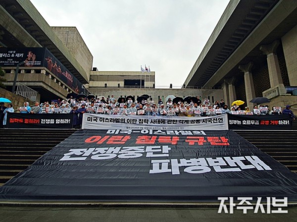 각계가 미국과 이스라엘의 이란 침략 사태에 관한 공동 시국선언을 발표하는 기자회견을 18일 오전 11시 주한 미국 대사관 인근 세종문화회관 계단에서 열었다.