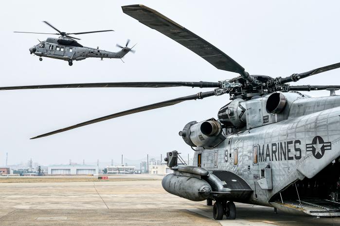 ▲ 해병대항공단과 미 해병대1해병비행사단이 실시한 ‘26-1 KMEP 연합 항공전투제대 훈련’에서 MUH-1 마린온 헬기와 CH-53E 슈퍼 스텔리온 헬기가 기동을 준비하고 있다. [부대 제공] |