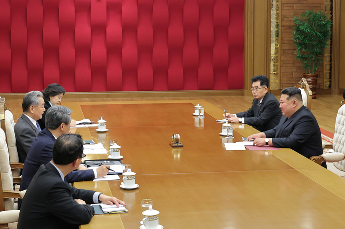 김정은동지께서는 왕의동지와 반갑게 상봉하시고 따뜻한 인사를 나누신 후 동지적분위기속에서 담화를 하시였다.