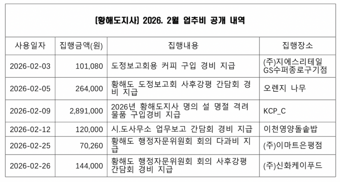 황해도지사가 2026년 2월에 가장 많이 쓴 항목은 설 명절 선물 구입이다.