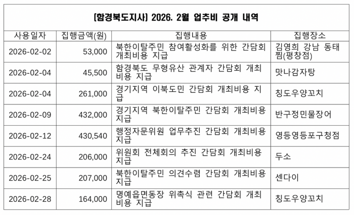 함경북도지사는 간담회 명목으로 동태찜, 감자탕, 양꼬치, 장어 등을 먹고 다녔다. 한 달에 두 번이나 같은 양꼬치집을 갔는데, 양꼬치를 무척 좋아하는 모양이다. 현 함경북도지사는 국힘당 전 국회의원으로서 반북 대결에 앞장섰던 탈북자 지성호다.