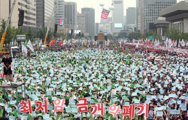 문재인 정부 이래 최대 규모의 집회가 광화문광장에서 열렸다. 민주노총은 30일 광화문광장에서 ‘최저임금개악법 폐기, 총파업·총력투쟁 선포, 2018 비정규직 철폐 전국노동자대회’를 열고 하반기 총력투쟁을 선포했다.